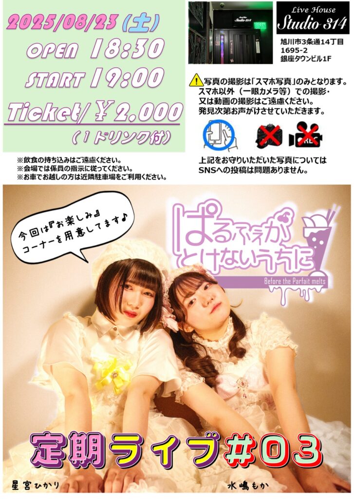 | 開催場所 | Sound Bar Studio 314 〒070-0033 北海道旭川市3条通14丁目1695−2 銀座タウンビル 1F |